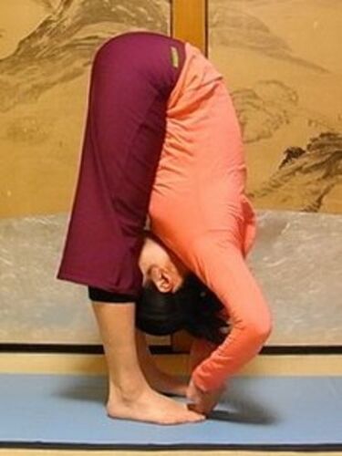 このポーズは、ヨーガ・バイブルには「前腕をほぐす前屈(パーダ・ハスタ・アーサナ)」と記載されています。 わたしは初めてこのアーサナを習った瞬間に、大好きになってしまいました。このアーサナはこのあと頭を下げて肘と脇を開くのですが、この最初の段…