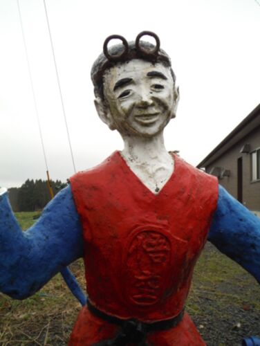 もう、なにがなんだか。なにから書き始めてよいやら。そんな、路上でのできごと。 場所は宮崎県小林市。小林インターチェンジ近くの道路沿いにある日本一猪料理のお店「みやまどり苑」というお店のこれは、オブジェ? そこにあるコンクリート彫刻は、有名な…